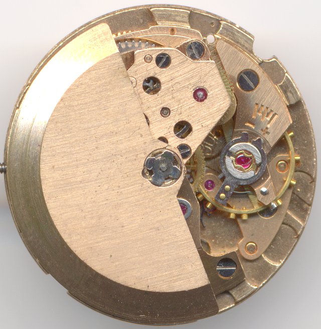 The one-piece oscillating weight , whose diameter is identical to those of the movement, sits on a thin axle and is fixed by a cross-type leaf-spring. You can easily imagine, that this construction will wear out soon and make the oscillating weight tumbling at the case back or main plate.