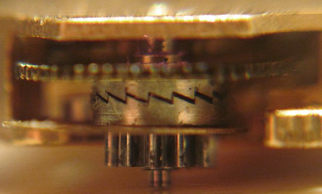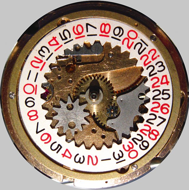 The date mechanism is constructed simply: The hour wheel has got a finger, which advances a star-shaped wheel every twice a day. Every second tooth of that gear is longer than the other one and connects to the date ring, advancing it one position.