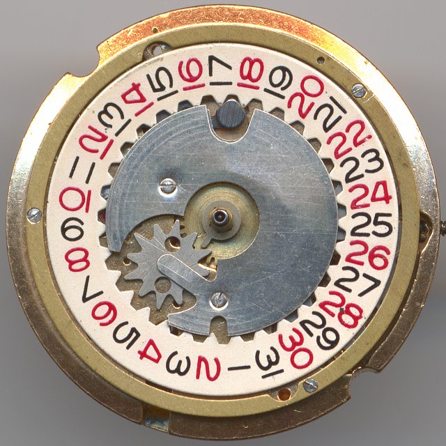 This movement has got a date indication, on which the odd days are written in black, the even days in red. There’s no quickset mechanism.