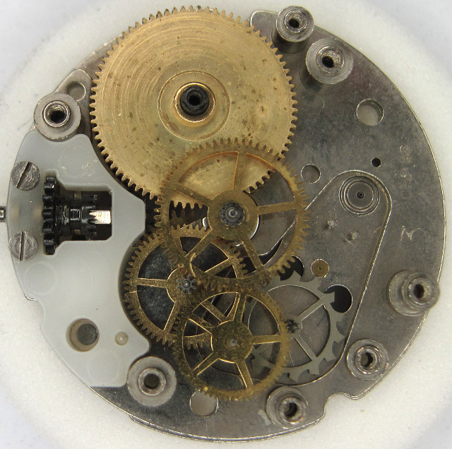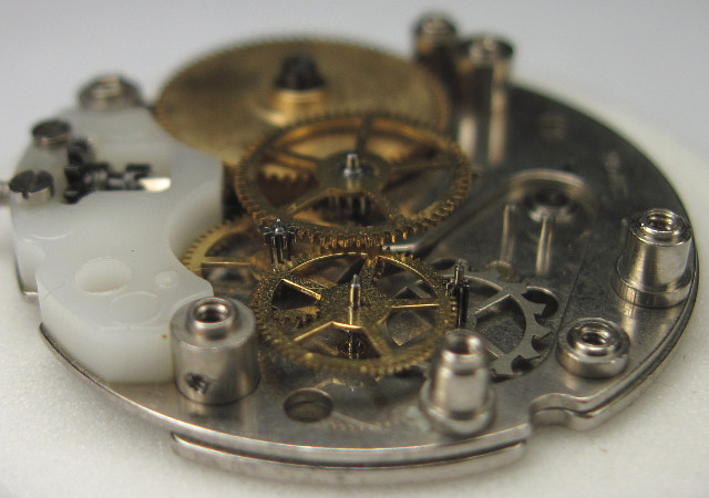 The stamped base plate with its contemporary plastic winding system frame shows, that it’s not a top movement. It’s a cheap pillar construction, where all bearings (except for the balance wheel) are free from rubies, but only made of brass.