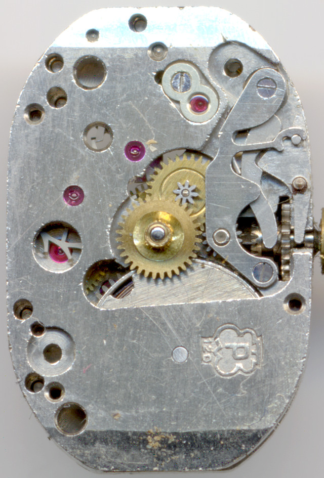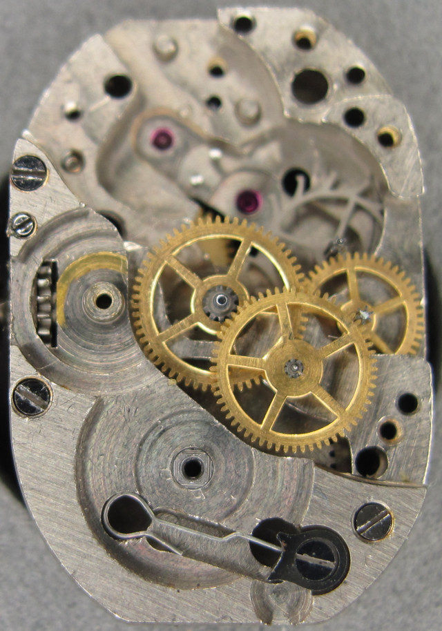 The main plate shows the typical construction of a tiny ladies’ watch form movement. All important bearings, except minute wheel and mainspring barrel are equipped with rubies. A noteable detail of the Peseux 120 is, that balance, wheel, lever and escapement wheel are on one line.