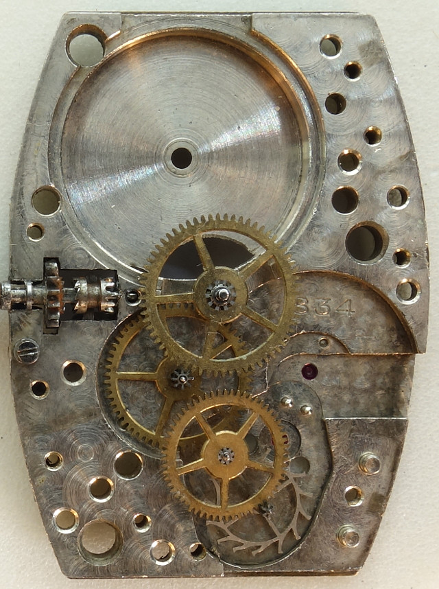 The Phenix 834 is not only decorated on the movement side (with stripes), but also on the dial side, here with a perlage. On the dial side, you can also spot the yoke winding system.