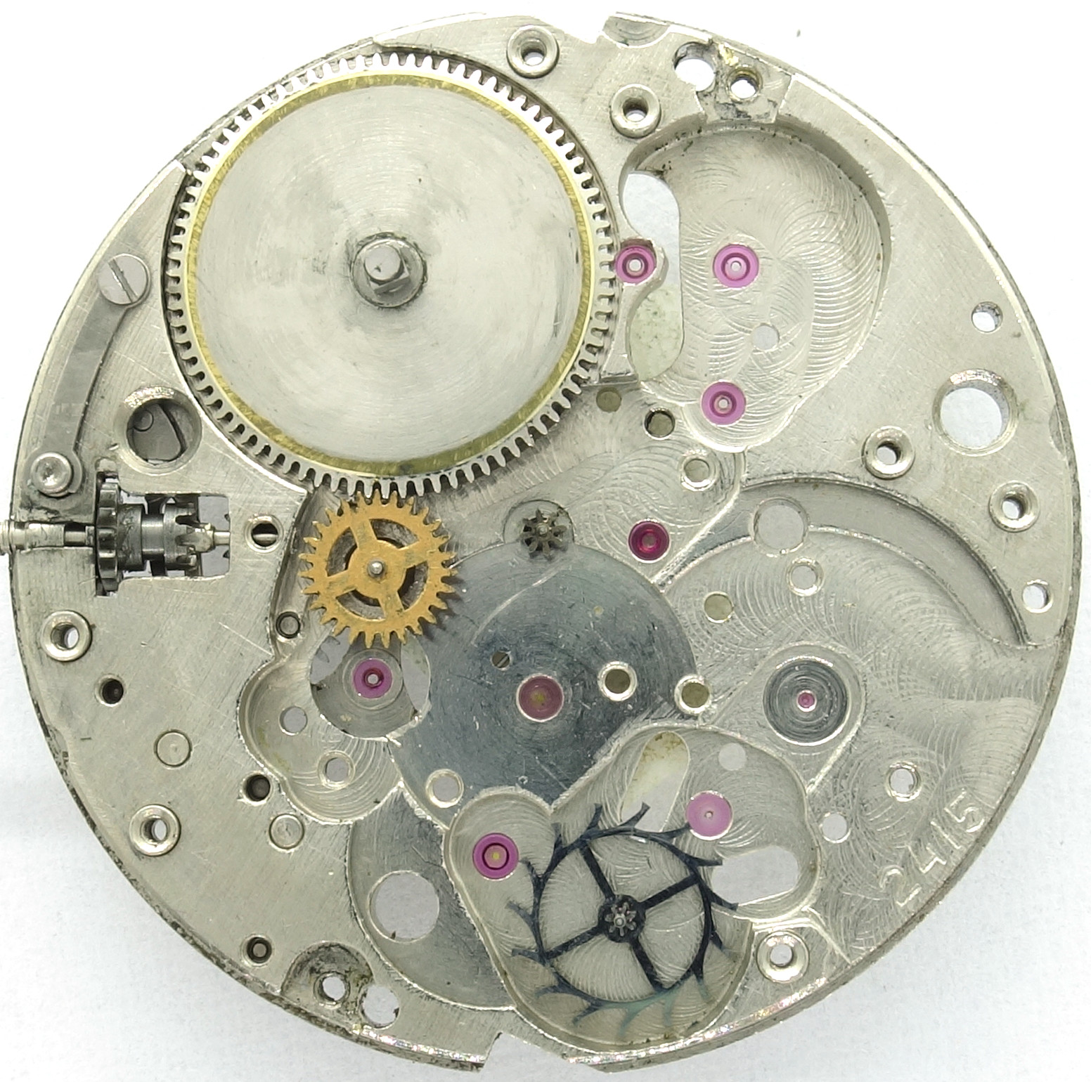 The Poljot 2415 uses a double ratchet wheel with a built-in clutch which disengages the selfwinding mechanism, when the movement is wound manually.