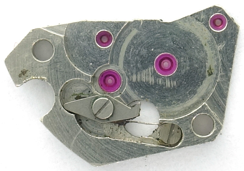 At position 8 o’clock, you can see the dial side shock protection bearing for the balance wheel, and next to it, the two recesses, through which the pallets of the lever can be inspected and oiled.