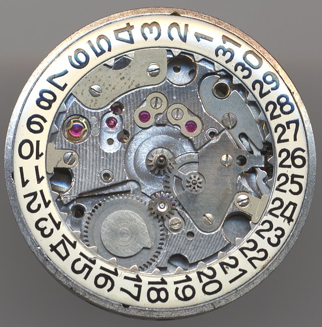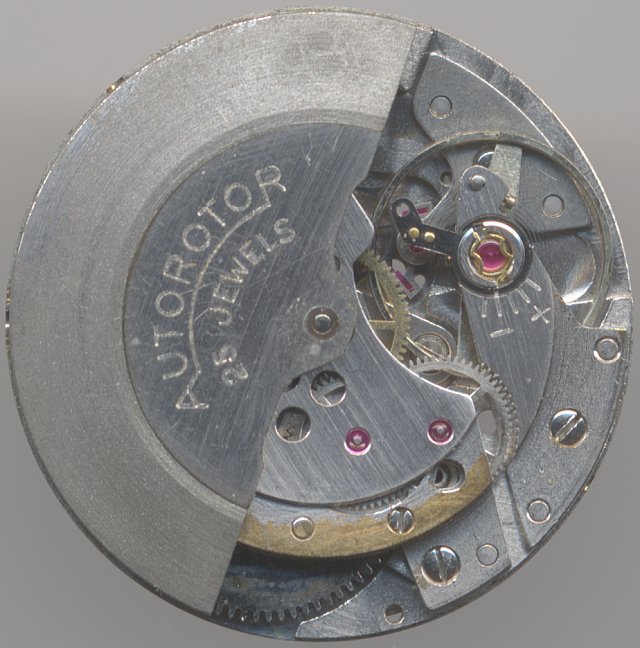 The axle-beared rotor winds the mainspring in both directions. This construction was used without changes in all further movement seriess including the series 1560. And even the last series, 1660, used that mechanism, but applied just a minor number of changes for cheaper production.