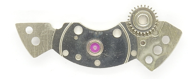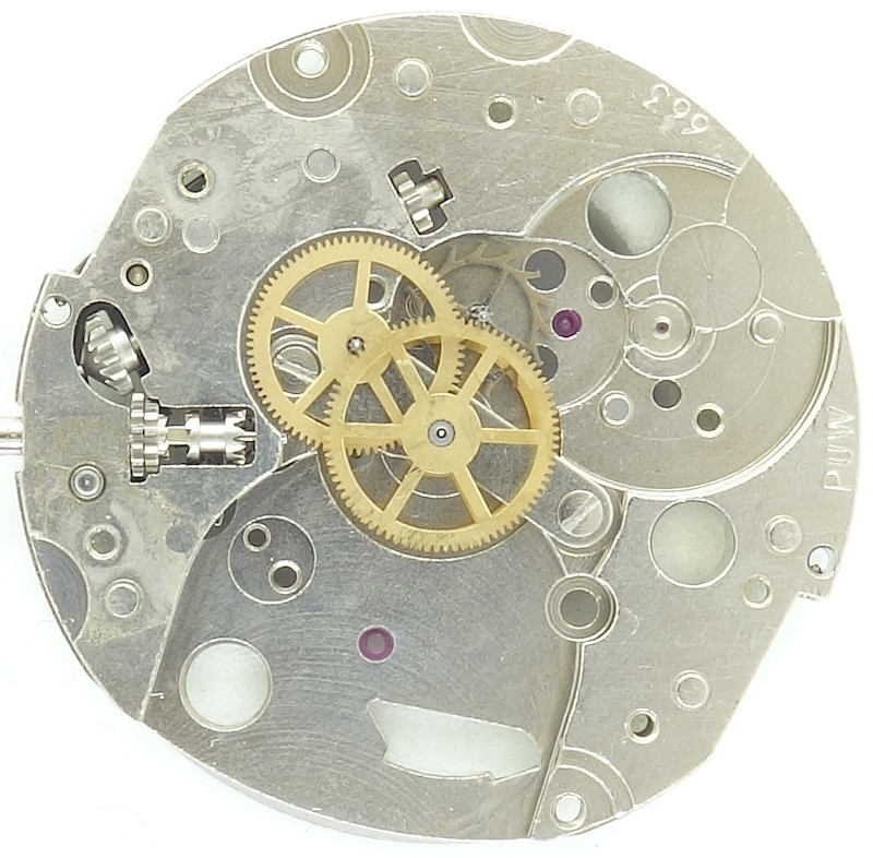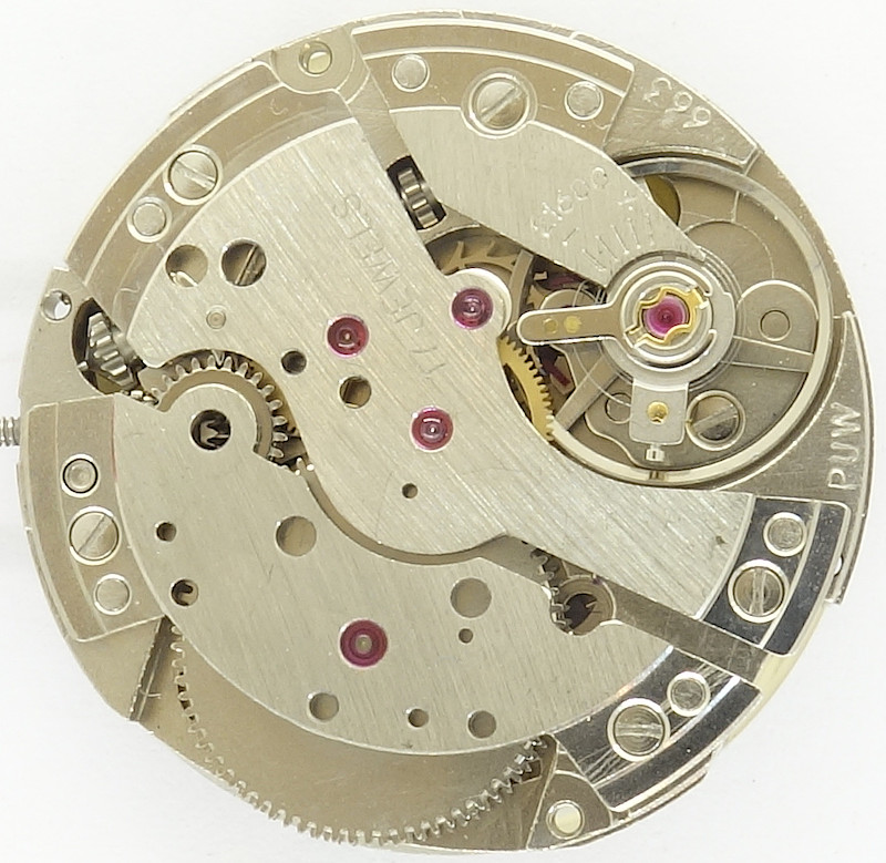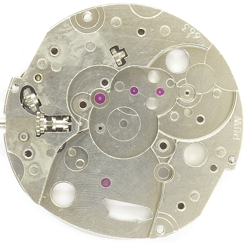 As all predecessors, the PUW 663 too, uses the classical gear train, with directly driven center minute wheel, which is beared under its own bridge. This bridge carries a bearing ruby, so that the minute wheel is ruby-beared on at least one side.