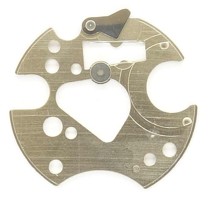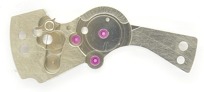 It has a lever and a pin, which are preloaded in corresponding cut-outs on the plate on the dial side, and discharge immediately at midnight. The long lever engages with the weekday disc, the pin into the date ring. The weekday disc must be advanced two steps, since it is bilingual.