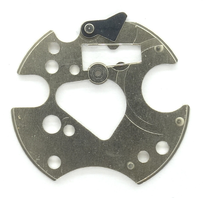 It has a lever and a pin, which are preloaded in corresponding cut-outs on the plate on the dial side, and discharge immediately at midnight. The long lever engages with the weekday disc, the pin into the date ring.
