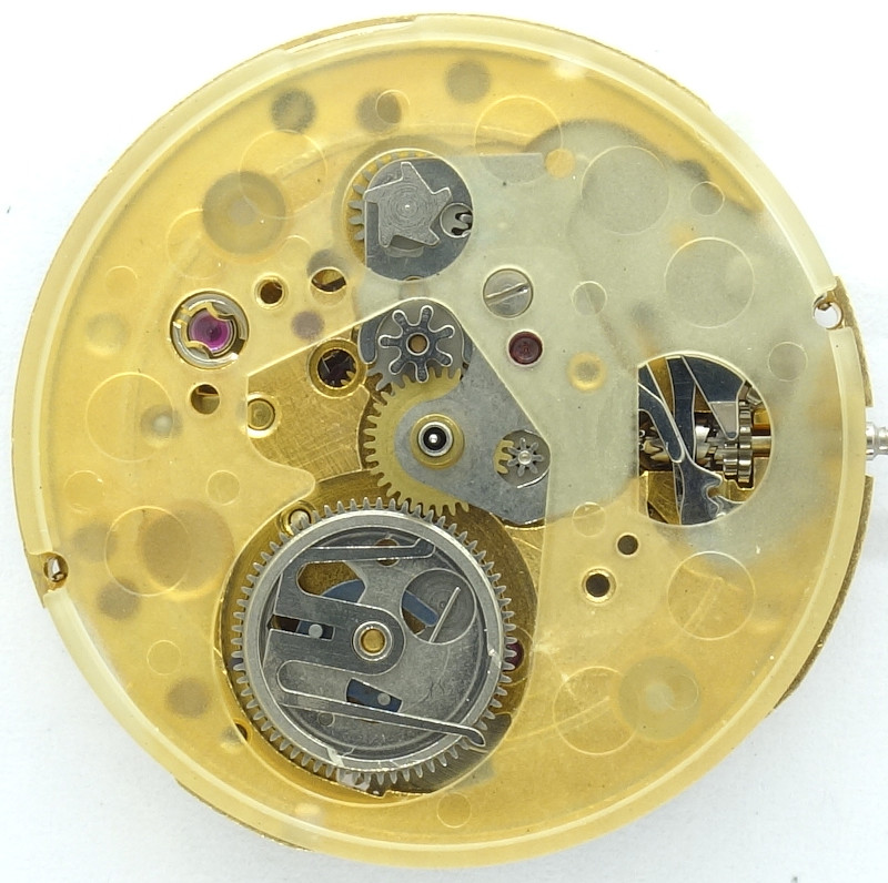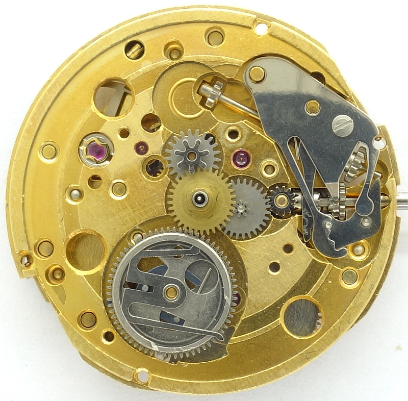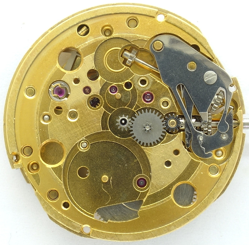 As usual, a swiss pallet lever escapement is used. A three-leg anular balance acts as regulating device, which beats with 21600 A/h. For the late 1970ies, this beating frequency is rather low, the ETA movements of the same eta already beat with 28800 A/h and offer, at least theoretically, better precision rates. In practical use, the differences are minimal, as the test on the timegrapher showed.