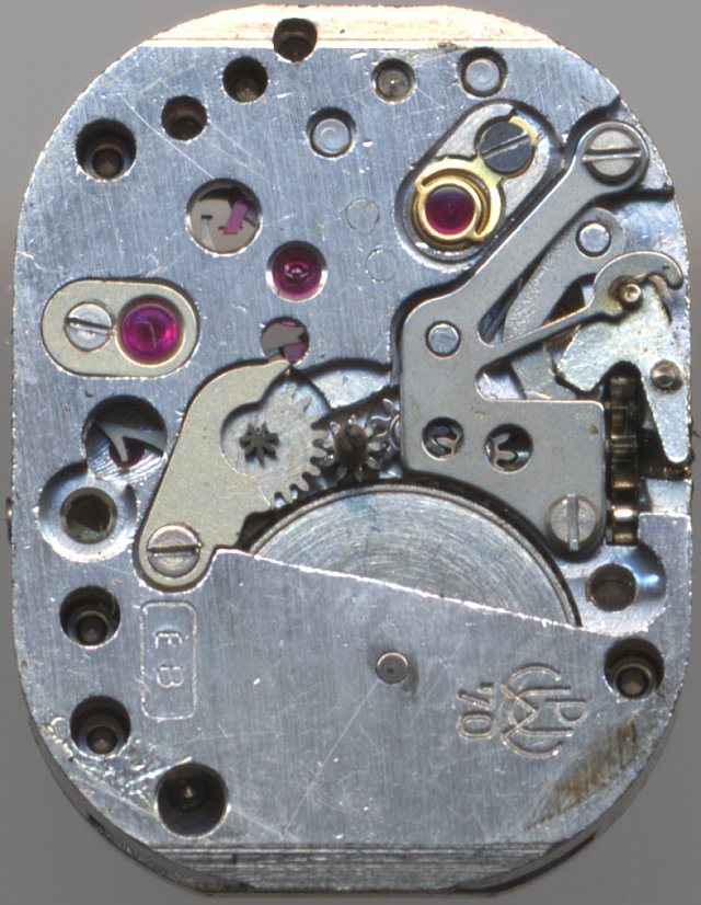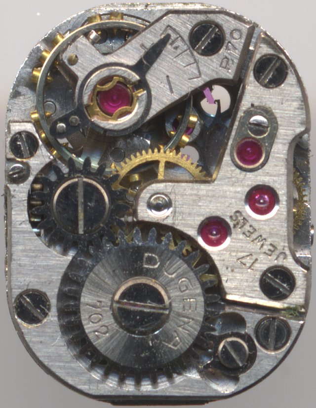The PUW 70, also marketed as Dugena 702, was another german ladies’ watch form movement. It has got a shock protected screw balance, secured in an Incabloc shock absorber and another simple shock protection, seventeen jewels, among them two cap jewels for the anchor wheel, and a yoke winding system.