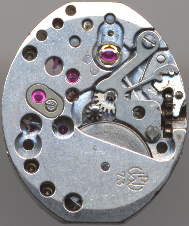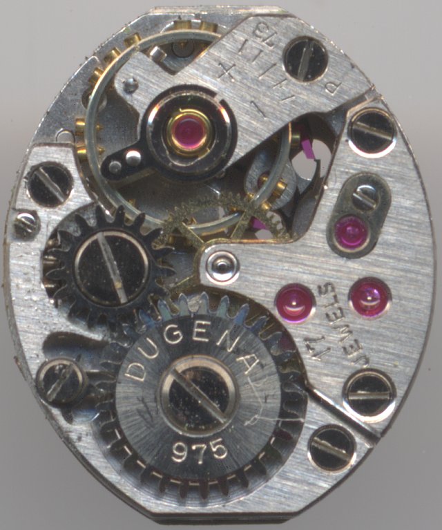 The PUW caliber 73 is a typical ladies` form movement in the common size of 5 3/4 x 7 lignes, which was also marked as Dugena 975 and available in different versions.