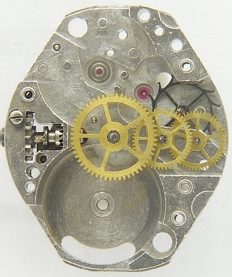 The gear train follows the common scheme with directly driven center minute wheel, third wheel, seconds wheel and the final large escape wheel.