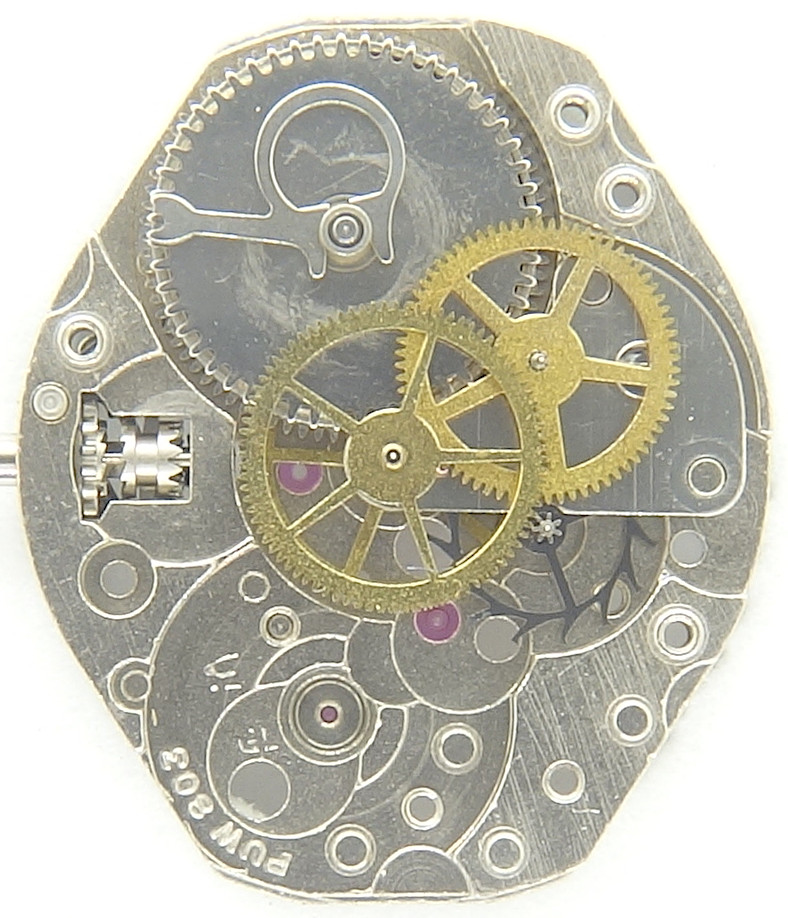 The PUW 803 uses a screw less anular balance with three legs, which is beared in two RUFA Antishock protection bearings. It beats with 21600 A/h and can be adjusted at the hairspring key only. As escapement, a traditional swiss pallet lever escapement is used.