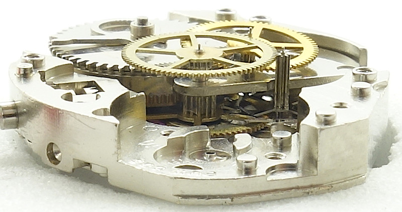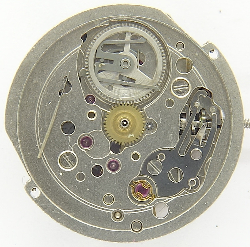 The gear train uses, because of the directly driven center seconds, unusally large gears for this kind of movement.