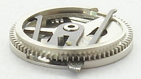 A spring at 8 o’clock engages with the sawteeth of the date ring and ensures, that the digits are always in the correct position. At 12 o’clock, you can spot the finger of the date switching wheel and how it will engage with the date ring. This finger is connected with a kind of slipping clutch with the wheel, so that it can build up enough tension to unload abruptly at midnight and advance the date ring one position.