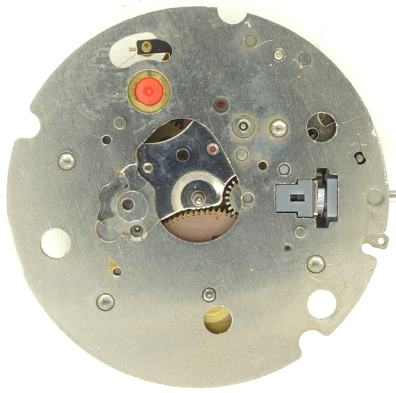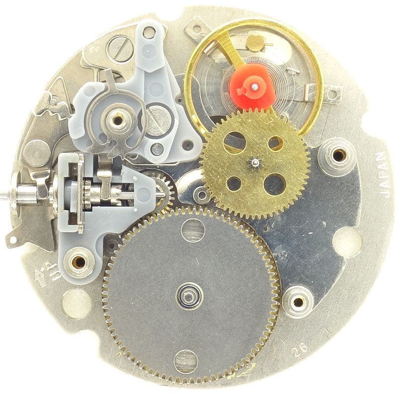 As on cheap quartz movements, the wheels on the dial side are mostly made of plastic.