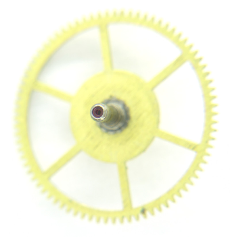 The minute wheel is followed by identically sized third wheel and center seconds wheel (directly driven). Finally, we have the steel excape wheel, into which the swiss pallet lever escapement engages.