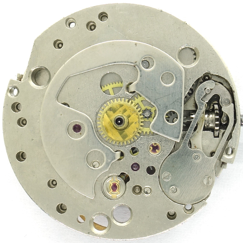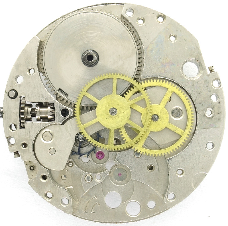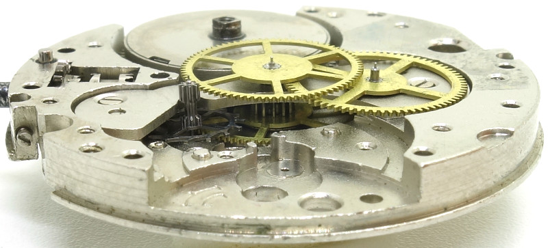 You can see the classical construction of the gear train on the center minute wheel, which is directly driven by the mainspring barrel and located under its own bridge.