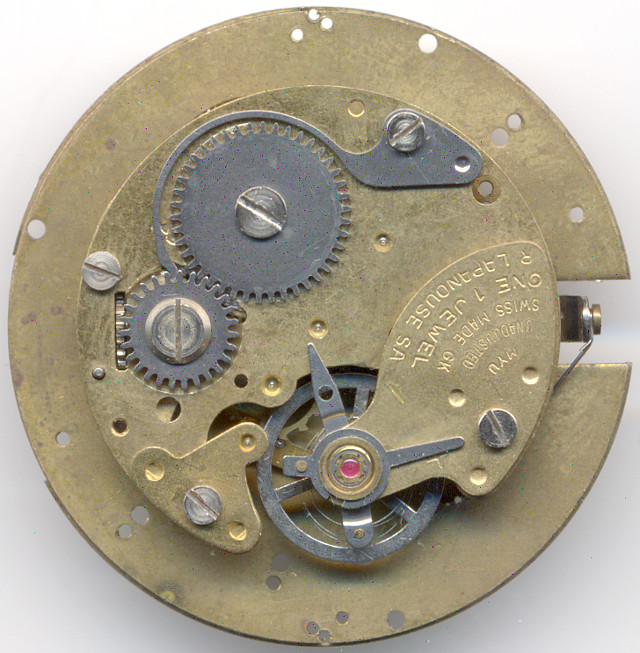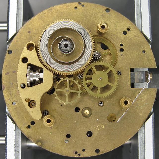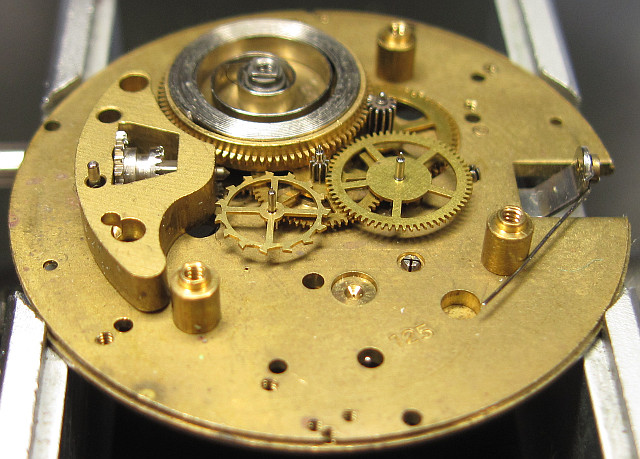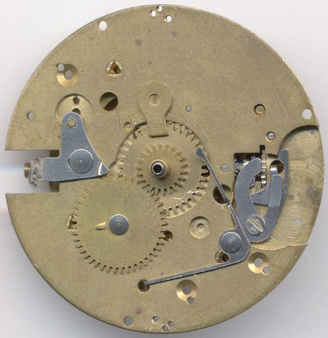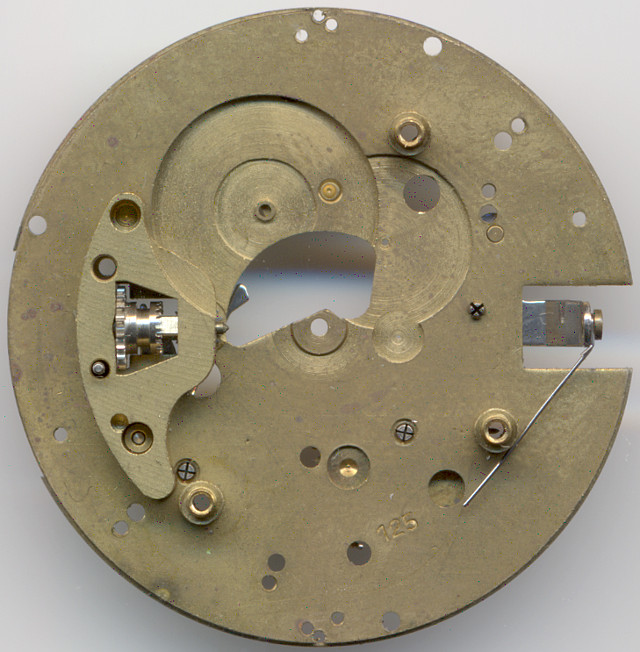 The gear train is on the movement side the same, as on a conventional pin lever movement with directly driven center second. Because of this, the mainspring barrel does not overlap the center of the movement, as it would do on a Roskopf movement.