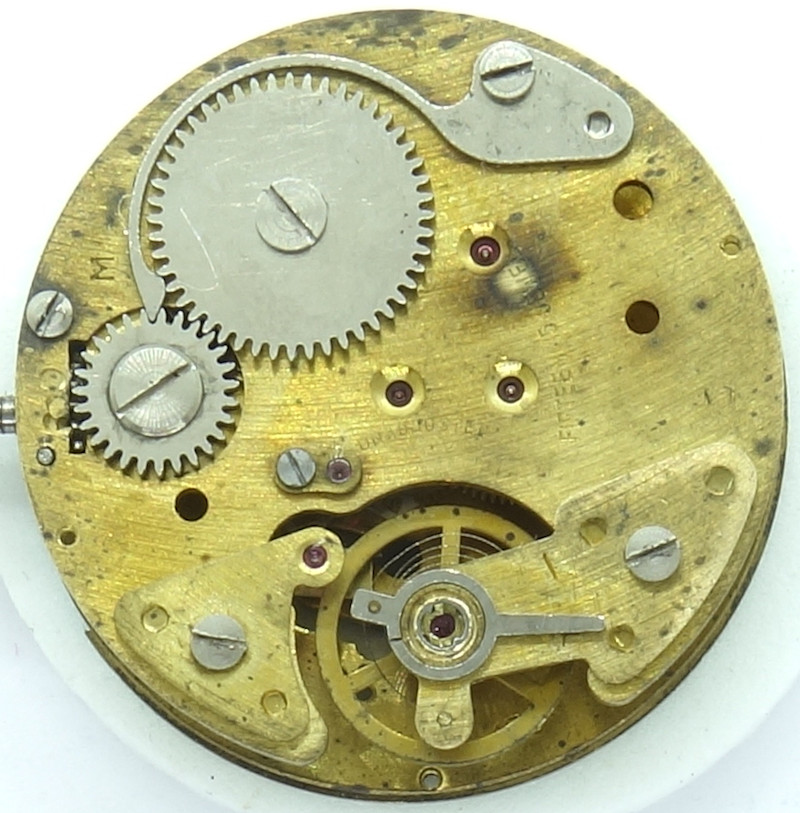 The large (it has got a diameter of 12 lignes) Rego 153 from then 1950s is a pillar construction of Roskopf type with a center seconds indication and it was equipped with 15 jewels, which was unusual for a Roskopf movement.
