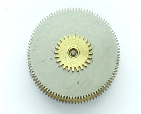 The lower, larger wheel drives the cannon pinion and the minute hand, the upper, smaller one the hour hand.