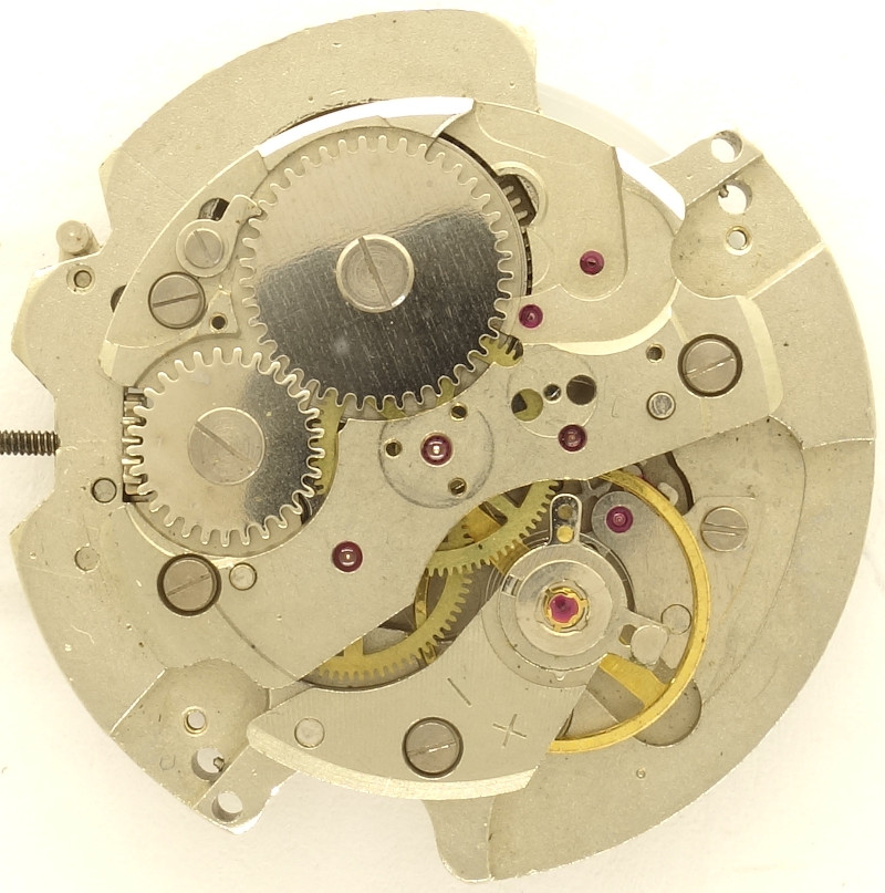 The base plate, which leaves lots of space unused, and which has got two indentations for access to the dial screws, shows, that all important bearings, including that of the center minute wheel, contain rubies.