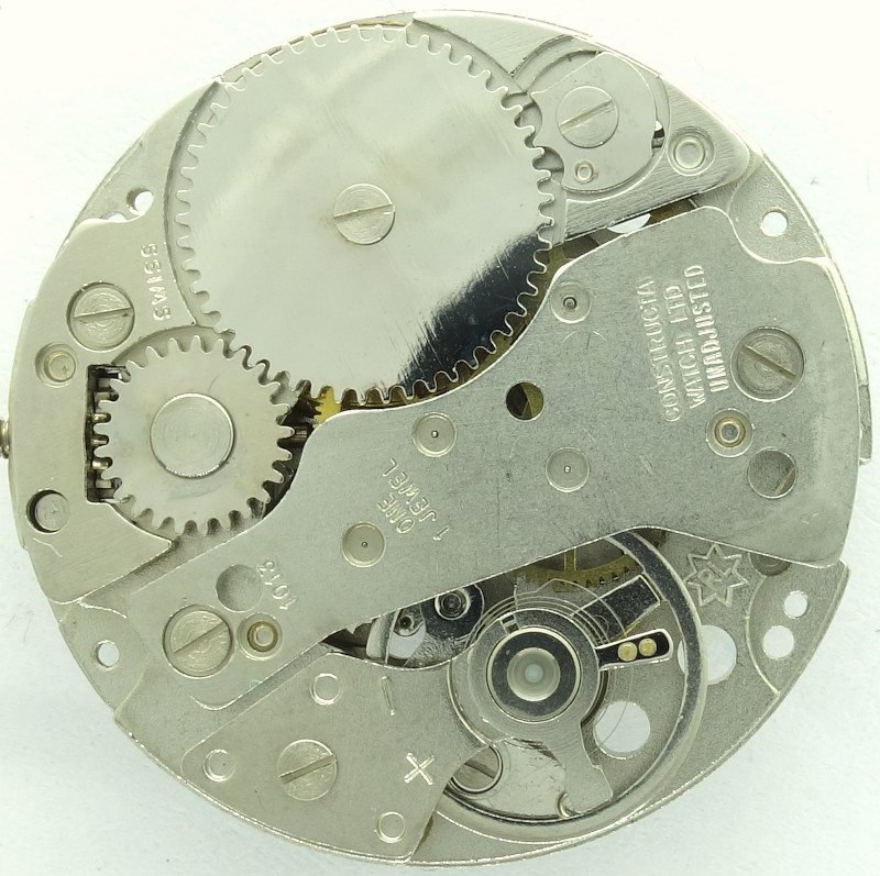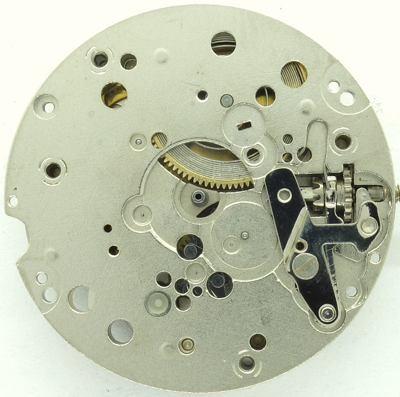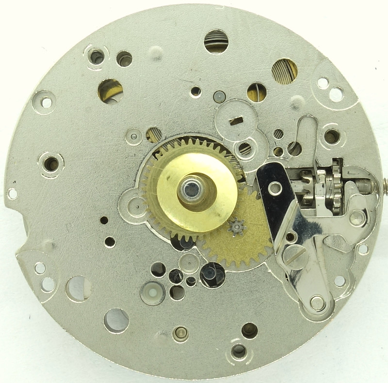 The gear train with its missing center seconds wheel is quite like that of a Roskopf movement. Here, the mainspring barrel drives the large driving wheel, followrd by third wheel, directly driven center seconds wheel (shortened axle on caliber 1011) and the escape wheel.