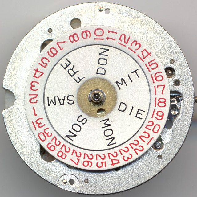 On the dial side, you see the date ring and the Ronda-typical, slowly switching date indication mechanism with switching star and hidden quickset mechanism. It works pretty unique: When you turn the hands backwards, the date is advanced quickly. The weekday can only be corrected slowly, but on a quarz movement, which runs one year without interruption, this is not a big problem.
