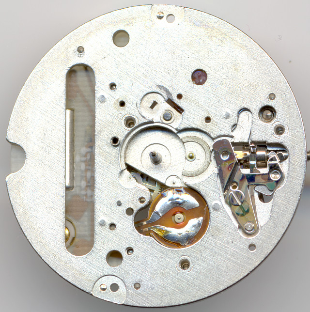 On the empty dial side, you see a large slot. It was used on the first and second version for the location of the quarz, which was much bigger that time. Later revisions used much smaller quarzes, which all had place on the electronics board.