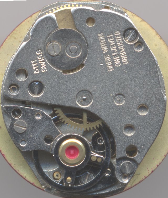 This is a very simple, tiny ladies’ watch movement, which contains no jewels except the one of the finger of the balance, which runs in two plastic bearings.