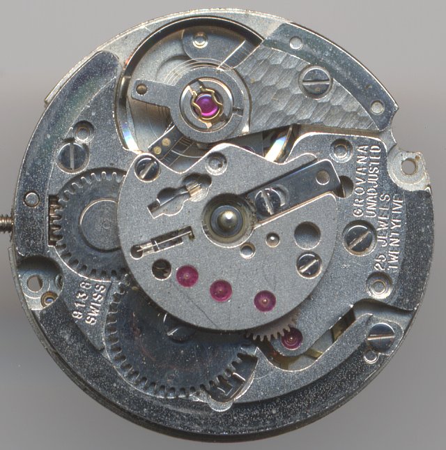 The 9138 is on top of the Ronda movements in terms of features and quality. It has got a true swiss palett anchor escapement, an Incabloc-secured balance, beating with 21600 A/h and 25 jewels altogether. The rotor winds unidirectionally; on manual winding, the mechanism is not released, so that the last wheel spins very fast. Only the rotor is detached from the gear now.