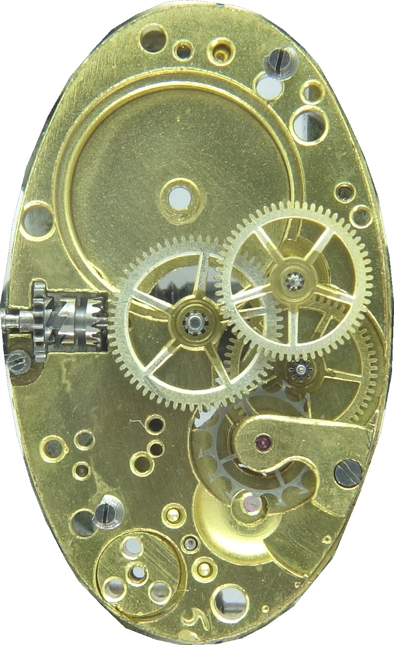 Besides that, it uses the common four wheels, directly driven center minute wheel, third wheel, seconds wheel and cylinder wheel. The latter is beared under its own cock.