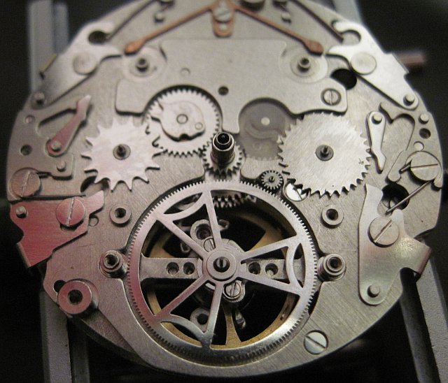 On the dial side, at 10 o’clock there’s the pinion for the minute wheel, and at “4:30”, there’s a slot for another pinion, which drives the tourbillon lookalike (or decentral second hand) at 6 o’clock.