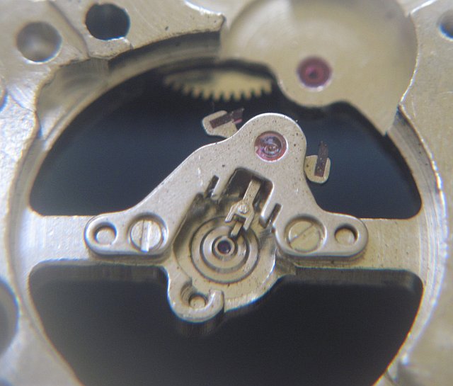 Weekday (left) and day (right) are indicated by two hands. Both indicators advance slowly over many hours, but also have got two(!) different quickset mechanisms at the same time: First by pressing the pushers at “8” (weekday) or “4” (day), second by turning the time back and forth a few hours, the plasic disc with its flexible finger ensures, that the date is not set back when the time is set back, thus allowing the date to be set forward only by turning the hands back and forth. Interestingly, the weekday on contrast, can be set back by turning the time back.