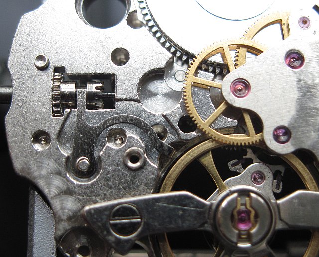 A useful detail of this movement is the hacking function, which is achieved by a tiny spring, that presses gently against the balance ring, when the crown is pulled into its third position. This mechanism is state-of-the-art and can be found in many swiss movements, too.