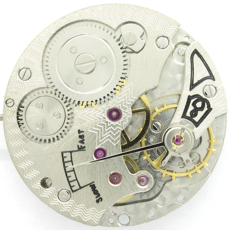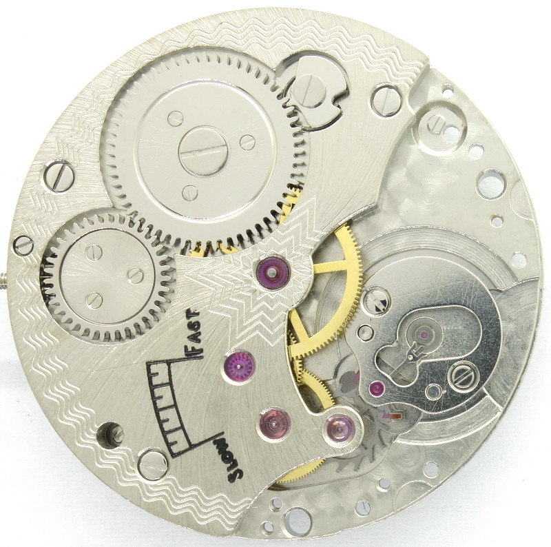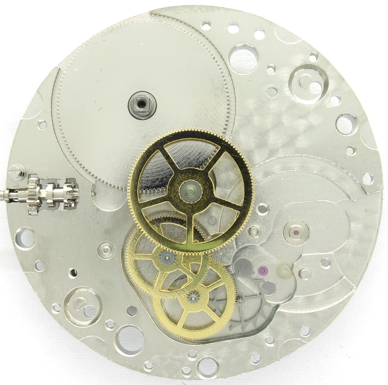 The construction is classical and consists of mainspring barrel, center minute wheel, third wheel, seconds wheel and escape wheel. Into the latter, a swiss pallet lever engages.