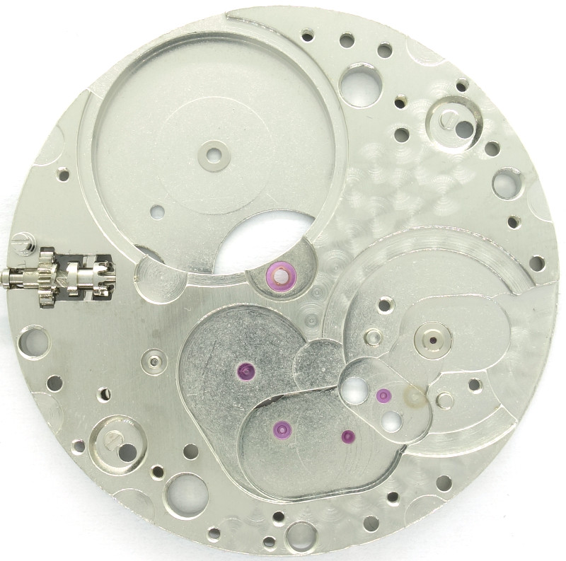 Looking on the base plate shows its technically good design and execution, so all important bearings contain rubies, even for the minute wheel bearing.
