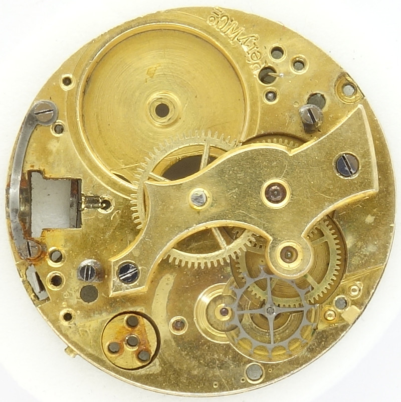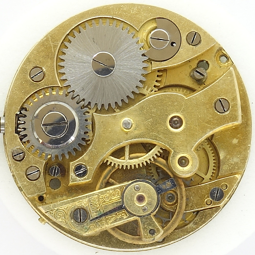 The gear train is the common one for a cylinder movement: The mainspring barrel drives the center minute wheel, followed by third wheel, fourth wheel and cylinder wheel. As usual the cylinder wheel is beared below an own cock.