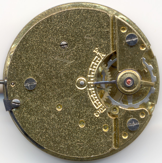 Its frequency can be adjusted with a long regulator arm with scale on the gear train three-quarter bridge.