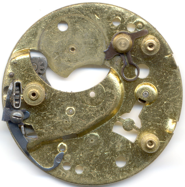 The base plate shows all signs of a cheap mass production. All bearings are only simple drillings into the yellow burnt brass plate, and the ratchet is also simple, but a genious construction, since its it ratchet and spring in one single part.