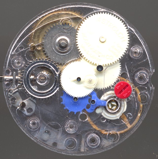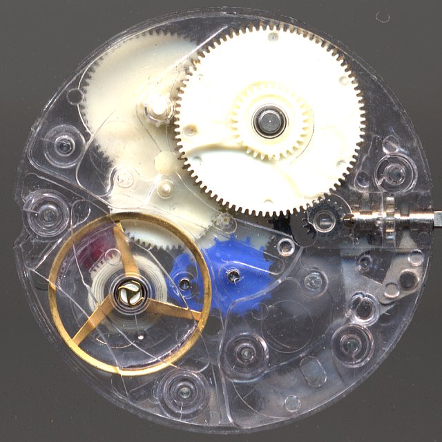 On this movement, not only the escapement parts and all gears were made of plastic, but also all plates and briges. Today, this is very common, e.g. on quartz alarm clocks, but at that time, it was revolutionary. The number of parts was also reduced to almost the half of those of a conventional movement. To achieve this, there were no screws at all, no complex mechanisms and so on.