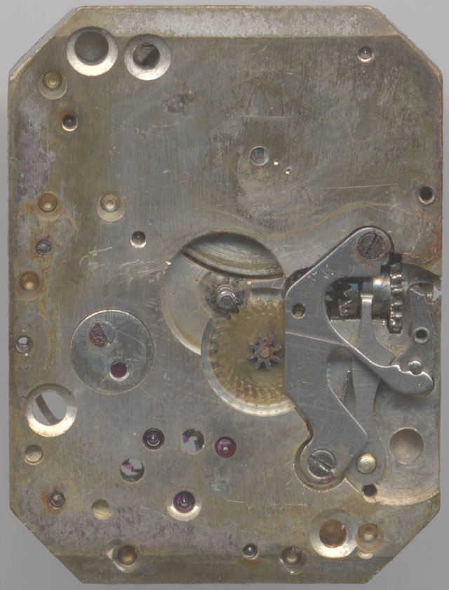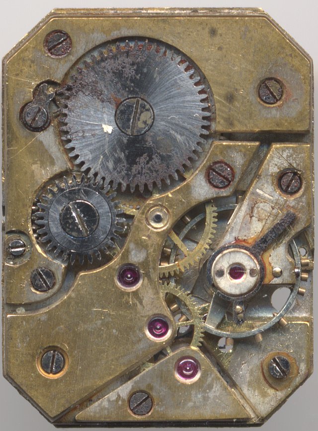 The rectangular and stricly geometric cut form movement has got a size of 8 1/4 x 11 lignes and is so well constructed (it contains 15 Jewels), that it still runs, even after is was heavily affected by water damage.