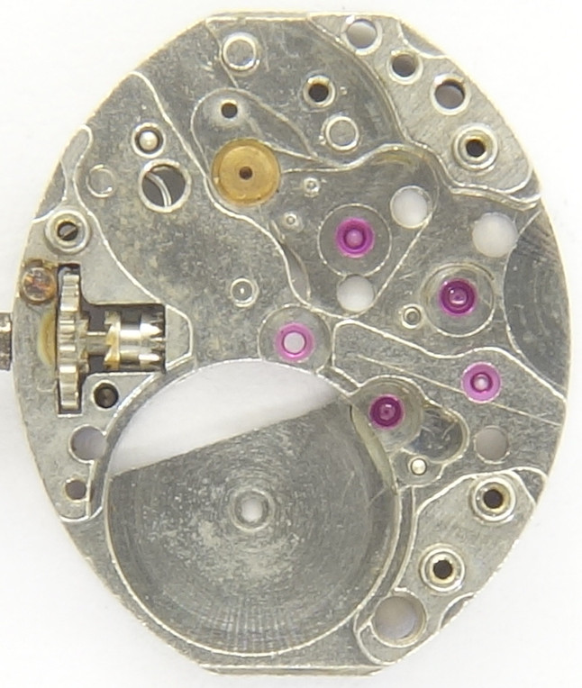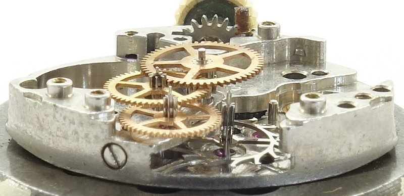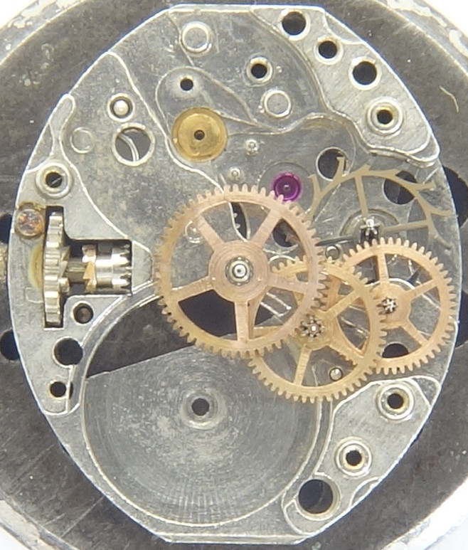 As common on movements of this small size, it is a multi-storey construction. The dial side bearing for the seconds wheel in on half height, above the large steel esape wheel.
