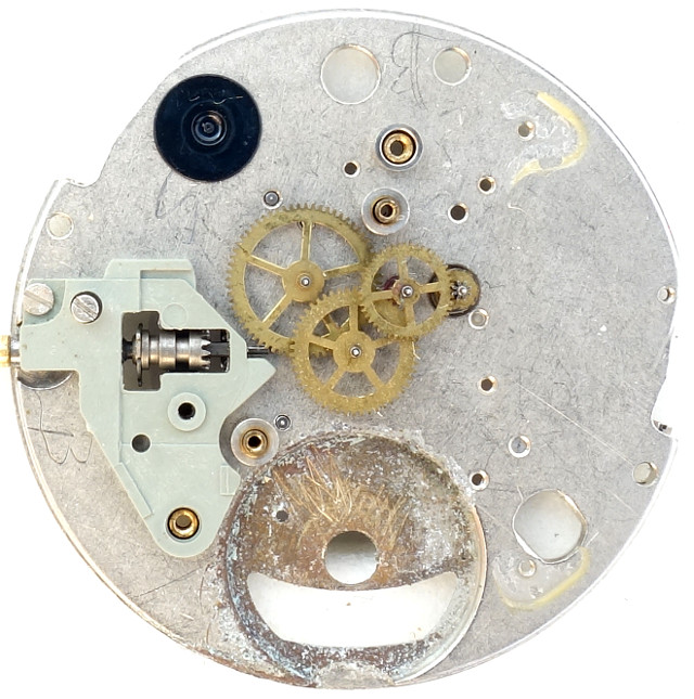 The gear train consists of a rotor (rotating magnet), a transmission wheel, the center second wheel and the third wheel, which drives the hands on the dial side.