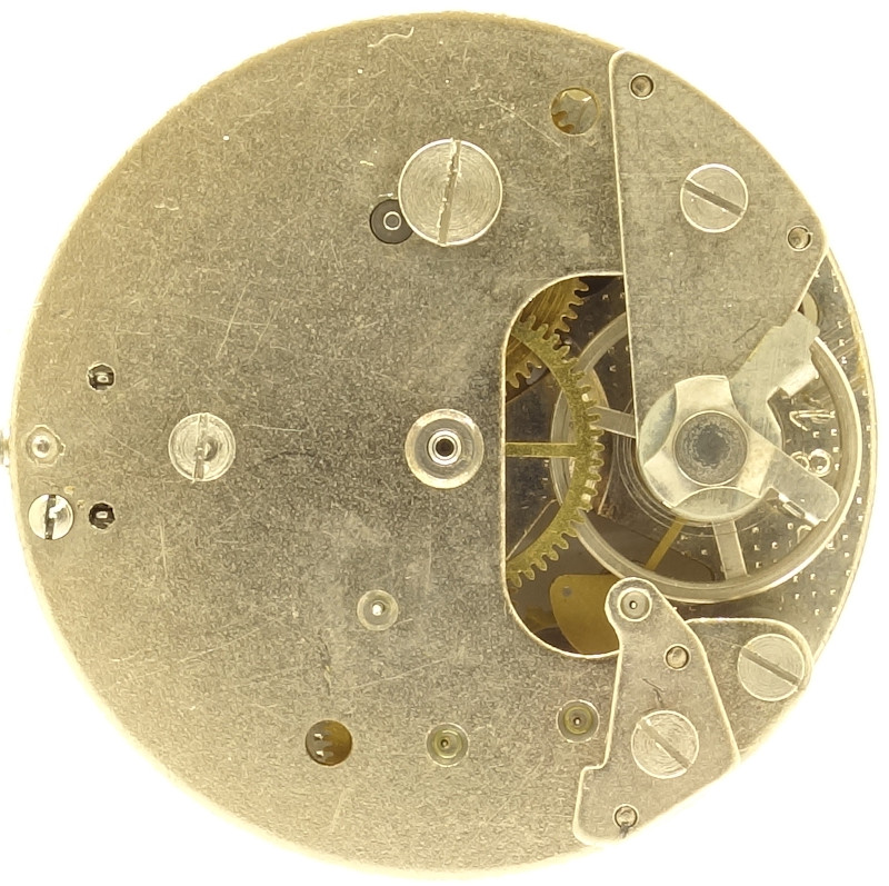 On left of the dial side, there’s the screwed-in balance bearing, which allows the height-regulation of the balance wheel axle, and on the right, you see the yoke keyless works. The ratchet is located on the inside of the main place, as told above.