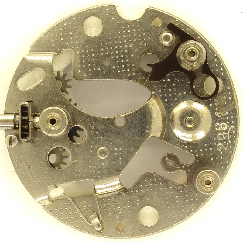 The base plate is stamped and a little higher in the middle. There are no bearing jewels on this pillar construction. At position 1 o’clock, you can see the ratchet, which is its own spring at the same time.