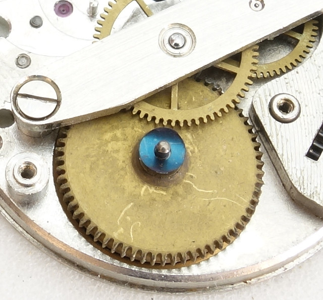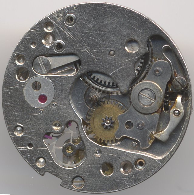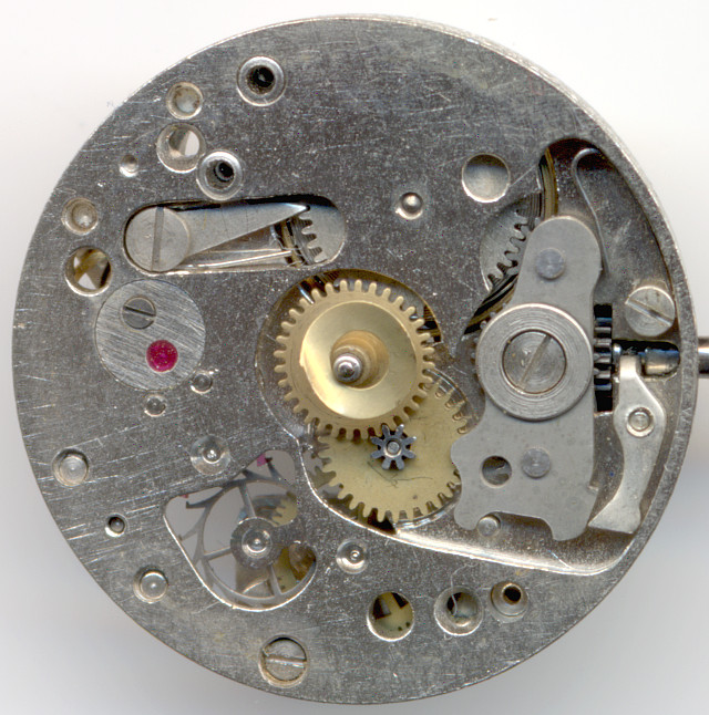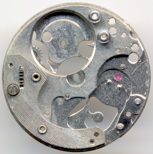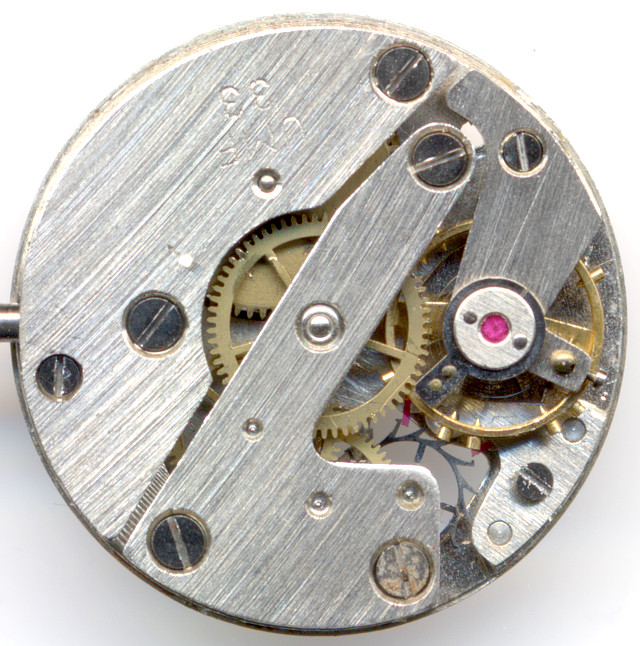Aside of the balance wheel bearing, there are no further bearing jewels, so that together with the ellipse and the two lever pallet, this movement has a total of seven jewels.