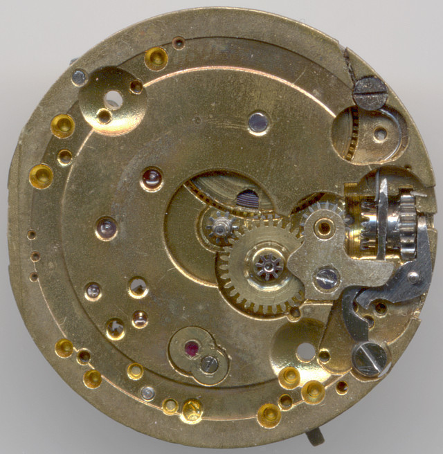 This 10 ligne pocket watch movement is of a high quality; it has got a bimetal balance and a doubled screwed chaton for the upper balance wheel bearing.