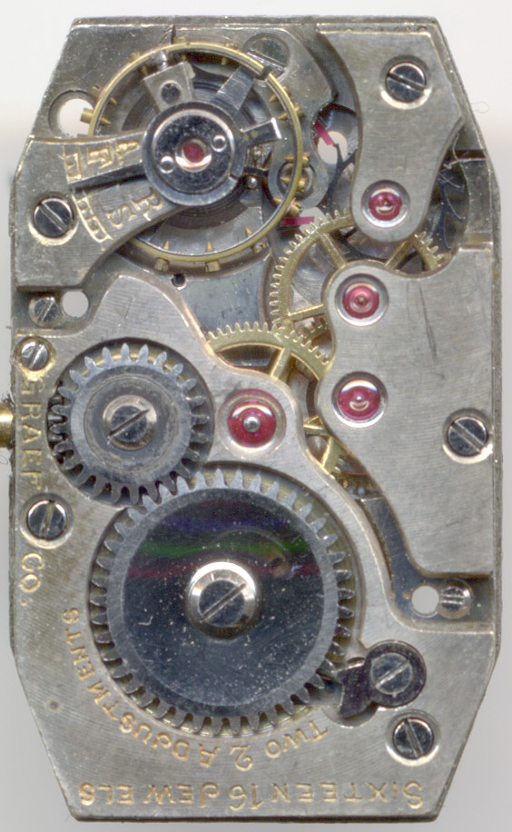 This movement is labelled “GRAEF CO.” and signed “SIXTEEN 16 JEWELS” and also has “TWO 2 ADJUSTMENTS”. On the dial side are also the numbers “35” and “527317”.