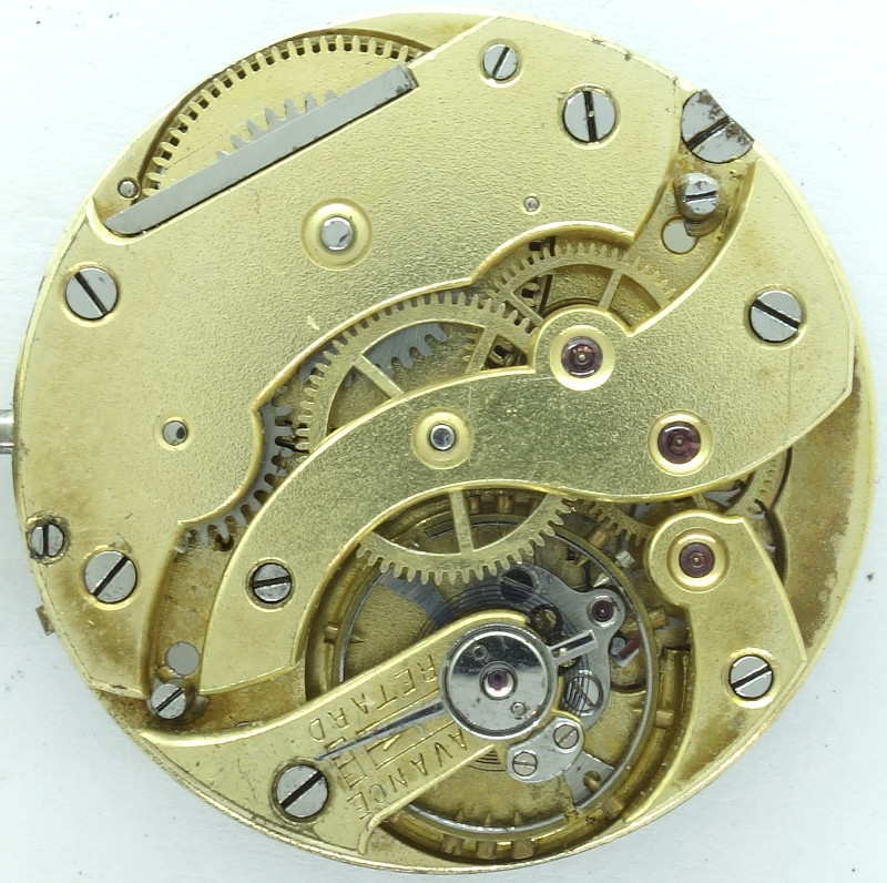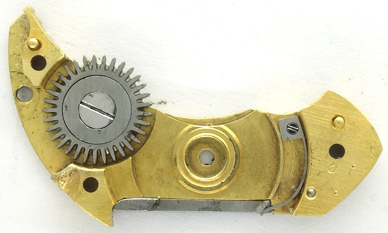 The crown wheel of this movement is beared and located on the inner side of the barrel bridge, as well, as the ratchet wheel. The ratchet, which is located on the side of the bridge, has got a spring on the inner side of the barrel bridge.